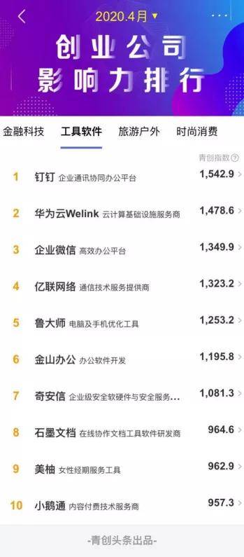 根据“2020年4月工具软件类创业公司传播影响力TOP10”榜单显示,小鹅通与钉钉、华为云Welink、企业微信等知名远程办公SaaS平台共同入选。