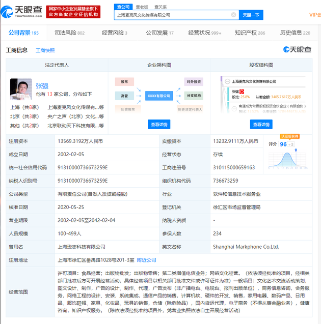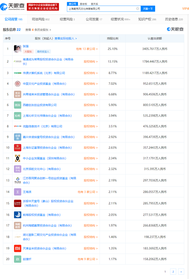 5月28日上午消息,天眼查数据显示,5月25日,上海麦克风文化传媒有限公司发生工商变更,投资人新增天津金米投资合伙企业(有限合伙),持股比例1.35%;此外,公司注册资本也从约1.32亿人民币增至约1.36亿人民币,增幅为2.78%,经营范围也新增第二类增值电信业务、网络文化经营等。