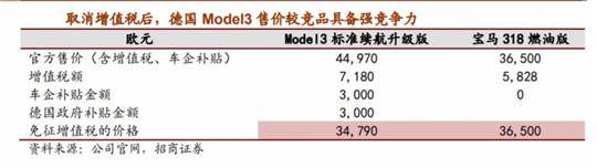 以德国购买纯电版高尔夫为例,官方指导价为3.19万欧元的纯电高尔夫,在减去6000欧元国家补助后,包含购置税到手价是2.59万欧元。但如果免除19%的购置税,到手价格降到2.08万欧元。同样的,特斯拉Model 3也直接从4.5万欧元降到3.48万欧元,大大刺激消费欲望。