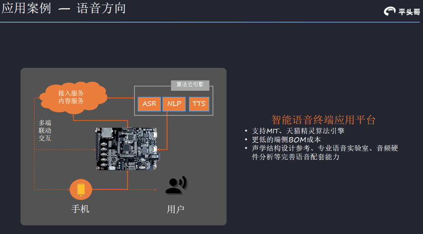 就以智能语音终端应用平台为例,里面支持MIT、天猫精灵算法引擎,并且能够实现更低的端侧BOM成本,该平台还具有声学结构设计参考、专业语音实验室、音频硬件分析等完善语音配套能力。
