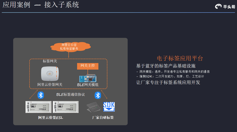 就以电子标签应用平台为例,它可以通过阿里云价签私有标签服务远程更新电子屏上显示的信息。具体应用在生活中,利用该平台可以远程更改超市的菜单,而不用人工去更换。此外,该平台还能做到非常低的功耗,待机时间在6年以上。另外,蓝牙的可靠性非常强,可以做到100%升级的成功率。