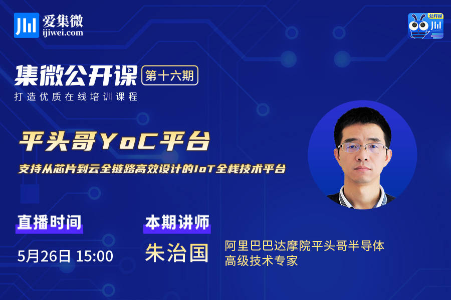 5月26日(周二)下午15:00,第十六期公开课邀请到阿里巴巴达摩院平头哥半导体高级技术专家、OS平台负责人朱治国,带来以《平头哥YoC平台——支持从芯片到云全链路高效设计的IoT全栈技术平台》为主题的精彩演讲。