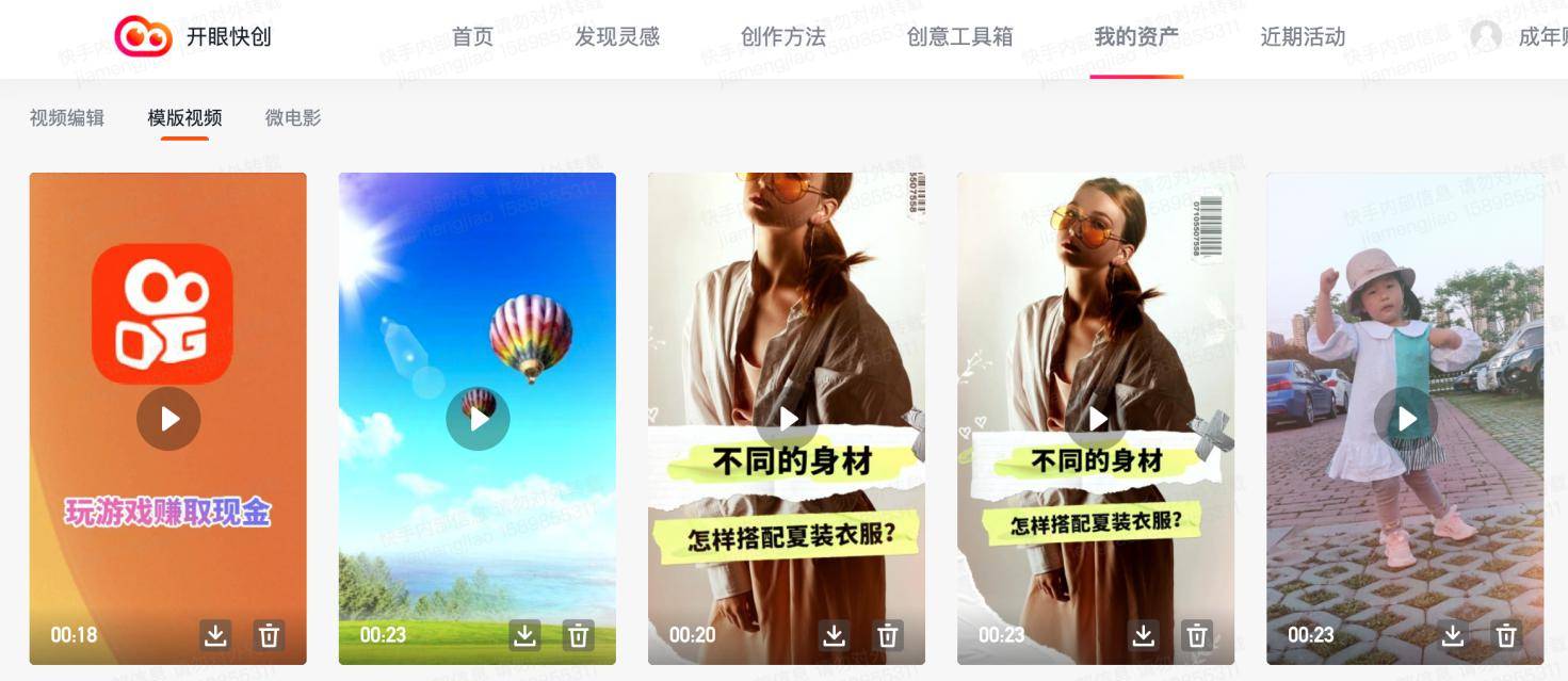 此次“开眼快创”打通了快手内部创意资产管理,即“我的资产”模块,将用户制作的创意视频按视频编辑、模板视频、微电影三大来源进行划分,实现了创意批量管理。同时,资产管理还与投放打通,用户可以在“我的资产”界面对创意作品进行整体管理,后期还会上线效果统计及优化分析等,创意效果从此清晰可见。
