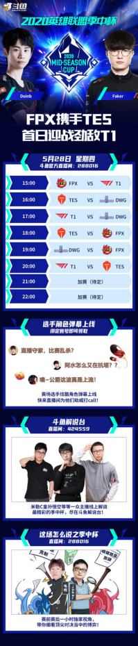 本次季中杯斗鱼签约人气主播Doinb、JackeyLove以及签约战队JDG、T1、DWG、GEN.G都将在此次季中杯中披荆斩棘,冲击冠军;来斗鱼为喜爱的选手和战队加油助威吧!