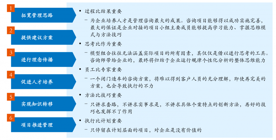 睿信咨询秉承 “过程咨询”理念,在咨询服务过程中,进行大量知识转移,培养客户的内部造血功能,同时协助客户实施项目推进管理(PMO)。