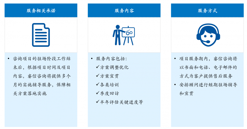 最后,睿信咨询在项目驻场阶段结束后,将为企业提供相应的售后工作。