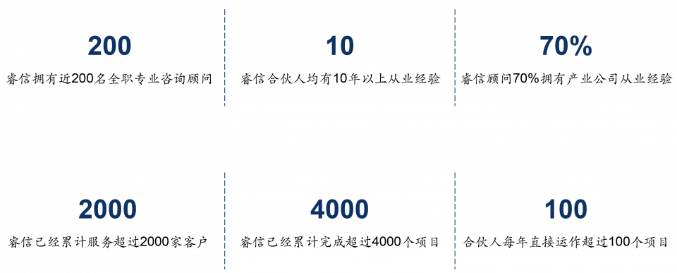 睿信咨询核心领导团队,在各业务模块拥有超过十年的管理实践和管理咨询经验,相关咨询服务案例近百例。通过独有的外部专家资源库和过往的咨询服务客户,睿信咨询具有丰富的外部专家团队,支持项目的运作和开展。