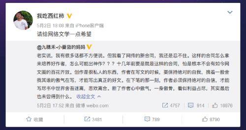 新合同中关于“著作权授权至到期为止”“委托创作”等的条款也让不少头部作者发声。例如笔名为“天蚕土豆”的作者在微博上指出自己的代表作《斗破苍穹》和《武动乾坤》因签署了委托创作合同而导致他对改编没有发言权,笔名为“爱潜水的乌贼”“我吃西红柿”“梦入神机”等的网络文学知名作家也纷纷在微博上发声。