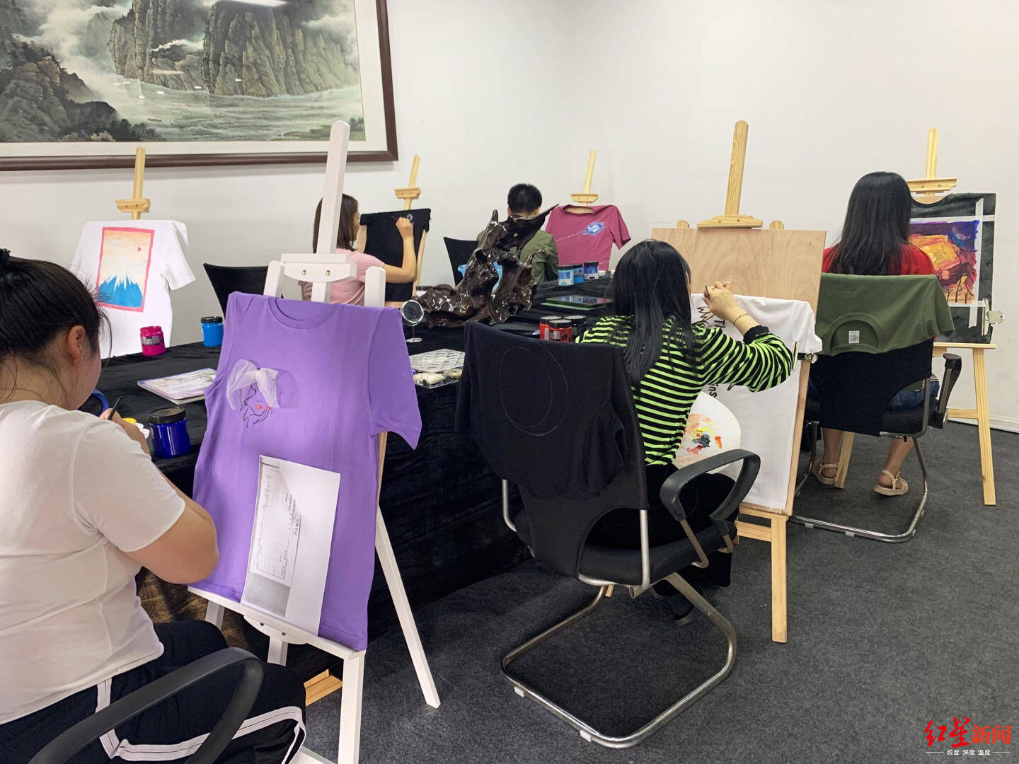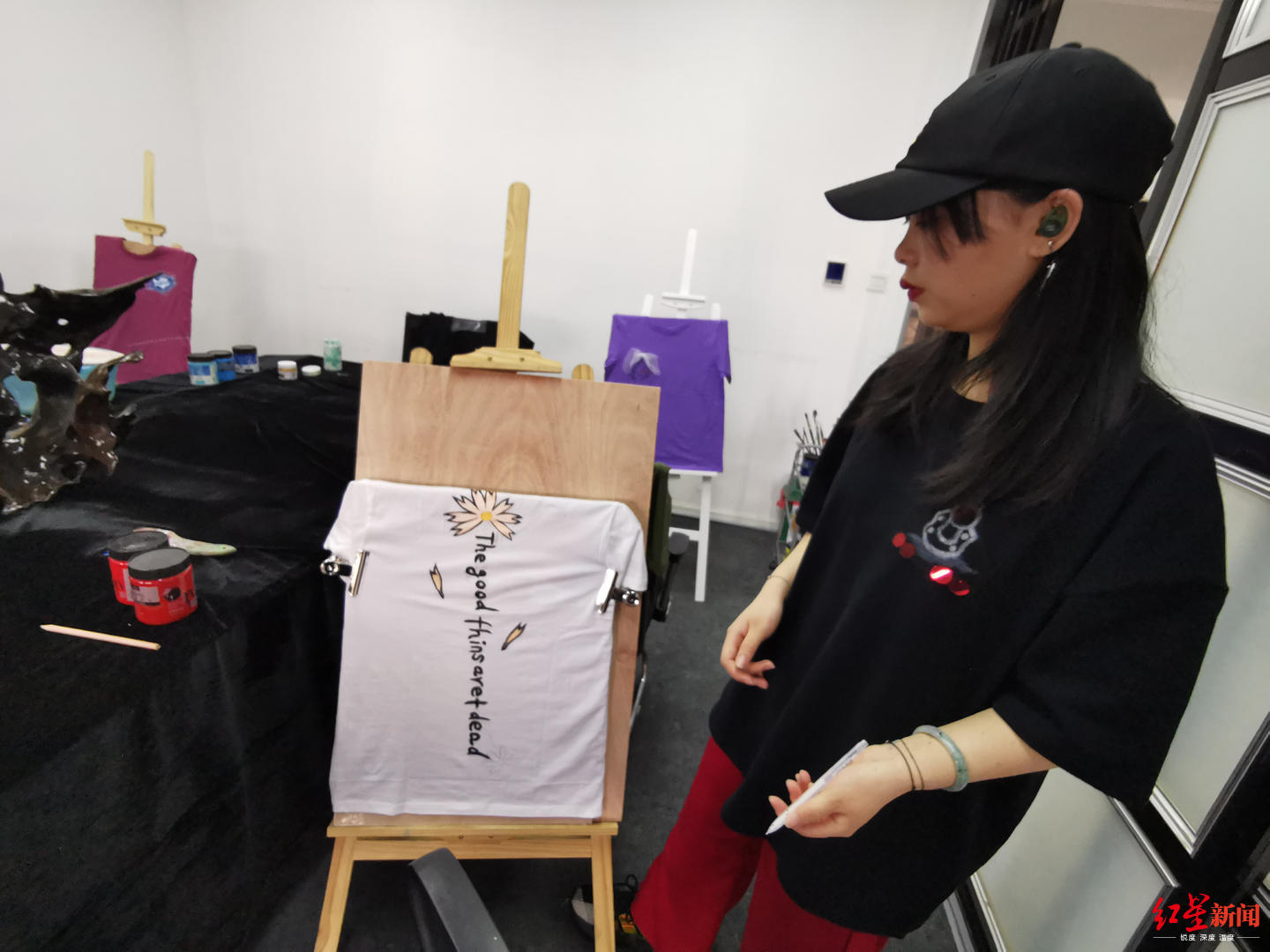 5月28日上午,红星新闻记者来到位于成都市天府三街一写字楼的四川欧阳环境艺术设计工程有限公司。在公司的会议室里,放着颜料、绘画笔、绘画板,以及多件个性十足的T恤,俨然画室的模样。