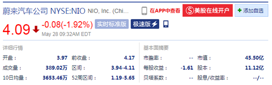 北京时间5月28日晚间消息,蔚来汽车(NYSE:NIO)2020年第一季度财报总营收为人民币13.720亿元(约合1.938亿美元),同比下滑15.9%。受此影响,开盘跌约5%,报3.97美元。