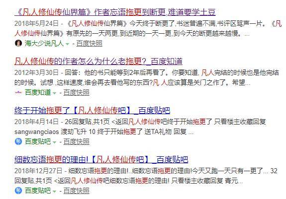 注意要素,“凡人修仙传”系列的作者忘语可算是拖更界的“惯犯”了,在多年的连载创作生涯中,忘语对拖更理由的构思恐怕不亚于在文章情节上下的功夫(误)——