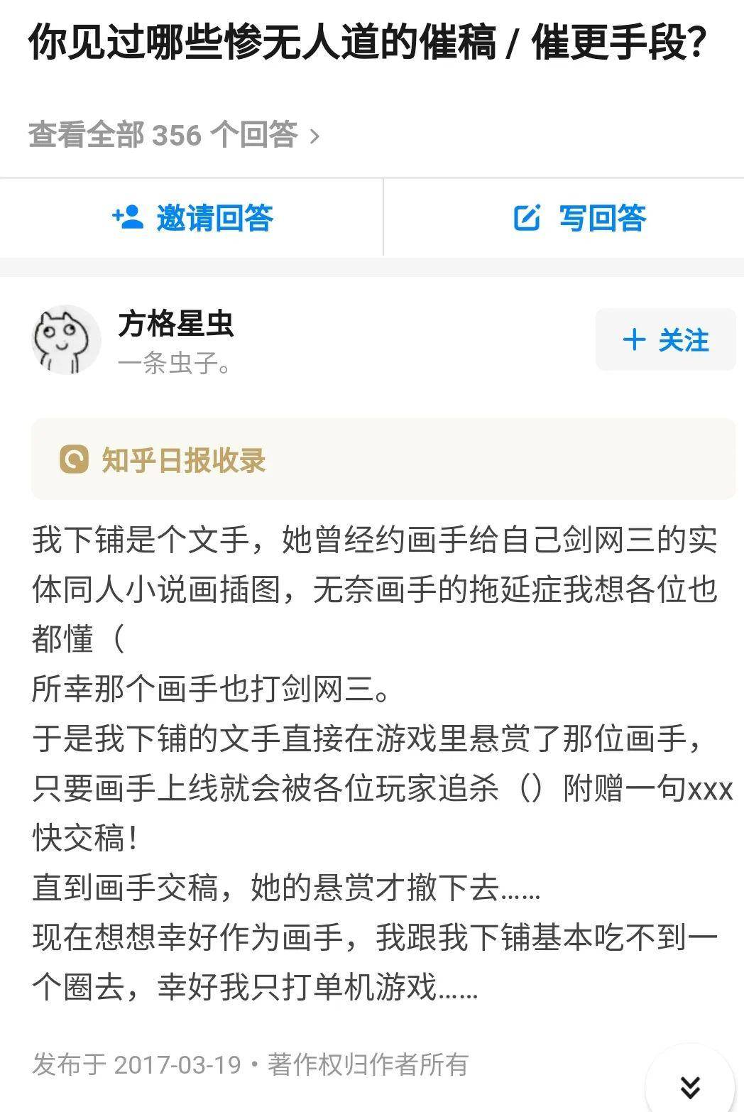 知乎里曾经一个有趣的回答,文手画手为一个游戏合作创作同人作品,因为画手玩游戏拖更,文手就想了办法派人在网游里对画手“悬赏追杀”,“直到画手交稿,她的悬赏才撤下去。”