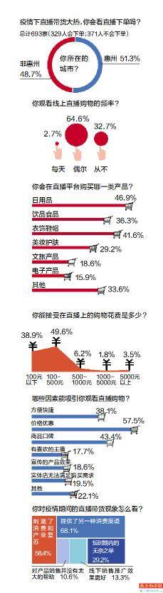 “疫情下直播带货大热,你会看直播下单吗?”连日来,南都惠州发出了关于这个话题的网络调查。截止到5月26日,共有693名受访者参与,其中过半是惠州网友。调查显示,近半数受访者称会看直播下单。