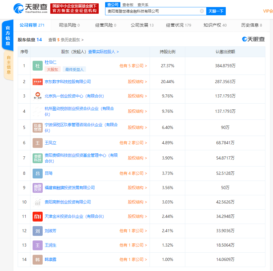 原标题:小米入股金融科技公司贵阳高登世德 京东数字科技控股有限公司为后者股东