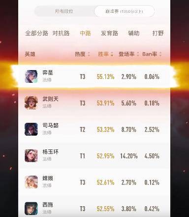 法师弈星的登场率仅为2.9%,被Ban率为0.06%,从这两个数据中我们可以看出弈星是一位冷门法师,不被玩家重视。但这样一位T3级别热度的英雄却成为了大仙口中的高分段法王,其胜率高达55.13%。榜单第二为武则天,胜率为53.91%。两者之间还是存在一定差距的。在平常的比赛中,弈星被玩家们看不上,认为他没有位移技能,输出也不稳定。然而在巅峰赛中弈星却表现得极其出色,让所有的法师英雄都感到自愧不如。