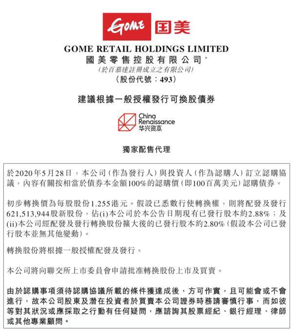 公告显示,国美向京东发行1亿美金可换股债券,初步股份转换价为每股1.255港元。假设已悉数行使转换权,则将发行约6.2亿股新股份,占公司于公告日期现有已发行股本约2.88%,及公司扩大后的已发行股本约2.80%(假设公司已发行股本并无其他变动)。