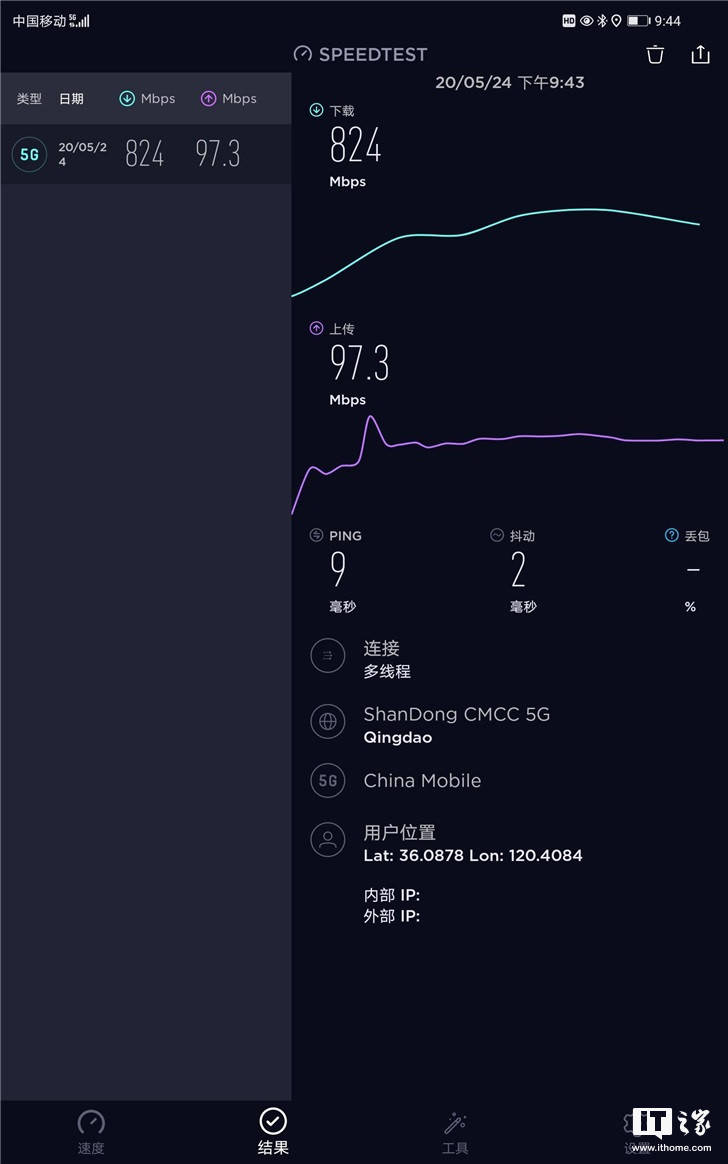 5G的速度有多快?在IT之家的测试中,我们随手在室外用软件跑了下速度,实测上行速度达到了97.3Mbps,下行速度达到了824Mbps,在这样的速度面前,任何的下载和数据更新都变得飞快。