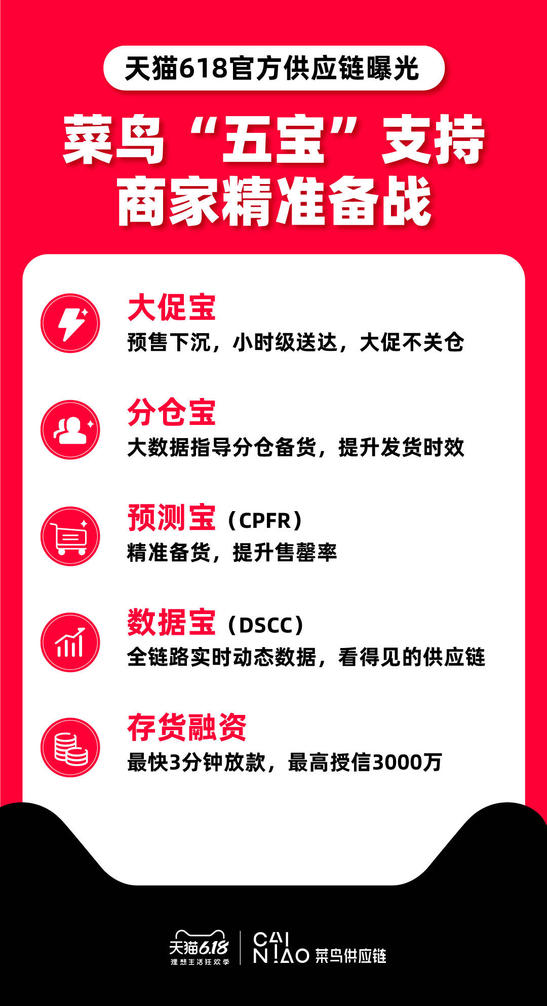 5月29日,菜鸟供应链宣布,将保障天猫618部分预售商品小时级送达。作为天猫官方供应链,菜鸟供应链推出“五宝”:大促宝、分仓宝、预测宝、数据宝和存货融资,在大促的物流洪峰中支持商家精准备战,提速、降本、提效。