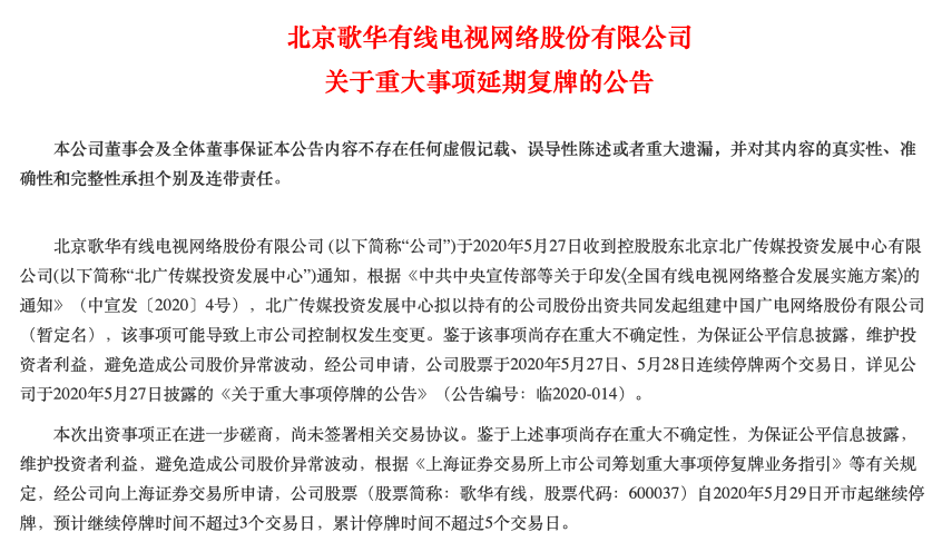 5月27日下午,歌华有线率先发布重大事项停牌公告,表示公司控股股东北京北广传媒投资发展中心有限公司,拟以持有的公司股份出资发起组建中国广电网络股份有限公司,而该事项可能导致上市公司控制权发生变更。
