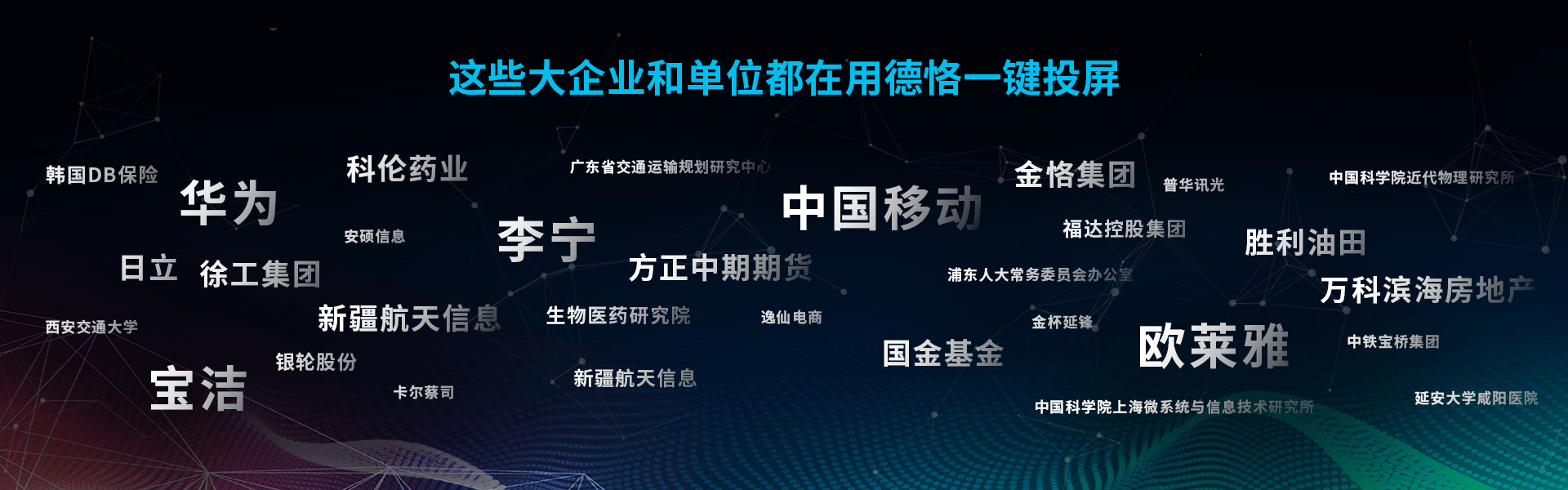 德恪一键投屏用户遍布全国各地,很多大企业和单位都在使用,德恪希望能为广大用户提供更智能,便捷,高效的投屏体验,持续为客户创造更大的价值。