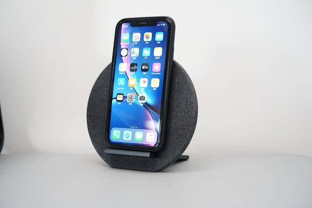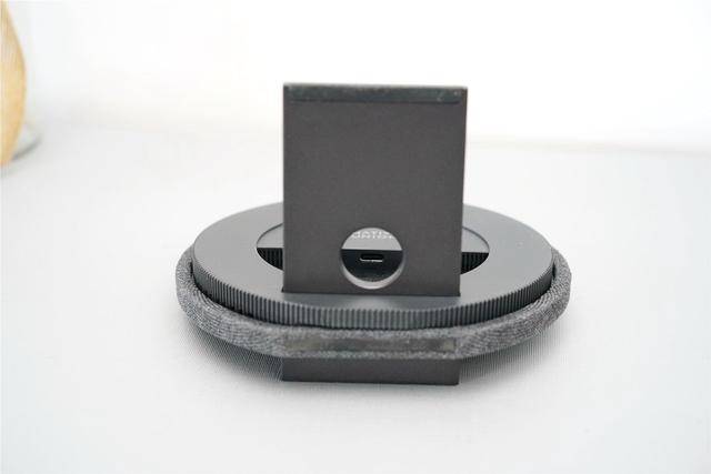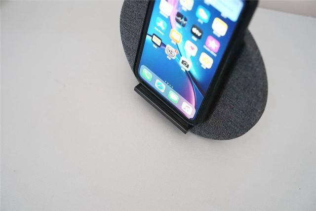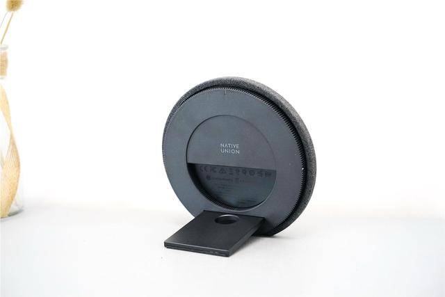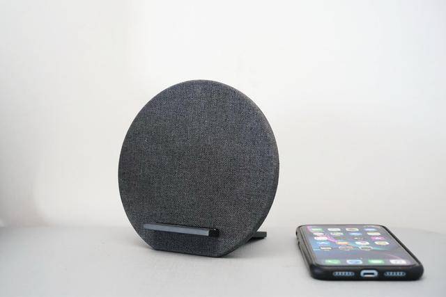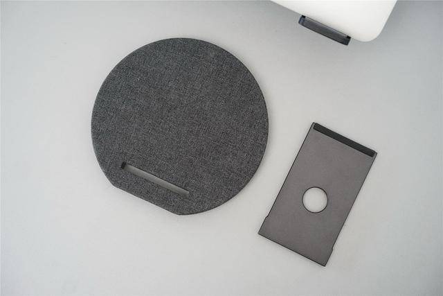 Dock立式无线充电器实际有两部分组成,充电器主体采用了简约的圆形设计(直径144mm),表面包裹了一层精选梭织面料。支撑板采用了钢制材料,正反面两个边角都贴有硅胶防滑垫。