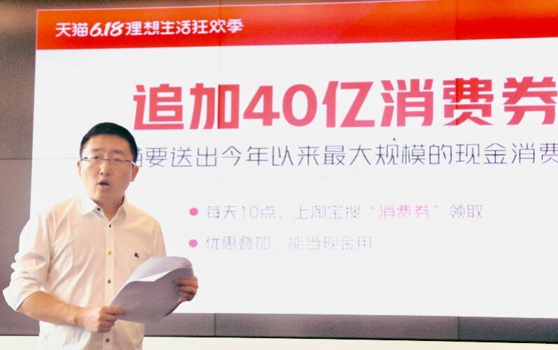 同日阿里巴巴集团副总裁、天猫618总指挥家洛在新闻发布会上宣布:由于618预售情况十分火爆,天猫决定将在618期间,再追加40亿现金消费券,费用由天猫平台支出。