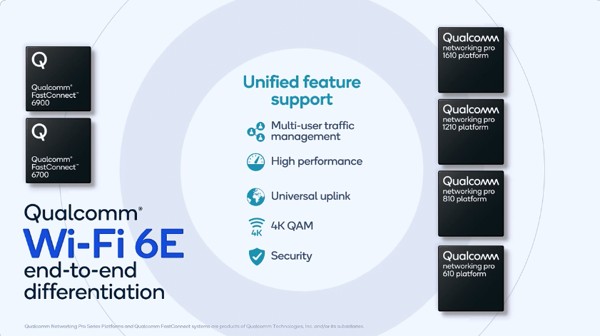 同时,高通也推出了四款支持Wi-Fi 6E的全新Qualcomm Networking Pro系列平台:Networking Pro 1610平台、Networking Pro 1210 平台、Networking Pro 810 平台及Networking Pro 610 平台。这四款平台均可以将Wi-Fi 6的关键特性组合扩展至6GHz频段。