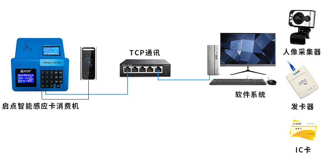 消费者只需持一张经过授权的IC卡或授权的人脸或实名认证微信公众号,感应读卡、识别人脸,即可完成各种消费的支付过程;而系统在后台强大的软环境和完善的硬件基础上完成信息加工处理工作,统一进行用户的授权、取消、挂失、充值等工作,并可查询、统计、清算、报表、打印各类消费信息及其它相关业务信息。