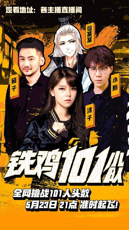 此次举办的"铁鸡101"活动是在斗鱼直播平台策划的以绝地求生大逃杀游戏为背景的比赛。很多主播都参与其中,其中包括三名小象的主播,茄子,仙某某和小新。虽然沫子不是平台签约主播,但是还是和其他三人跨界组成铁鸡101小队,并且最终成功达到101击杀数。