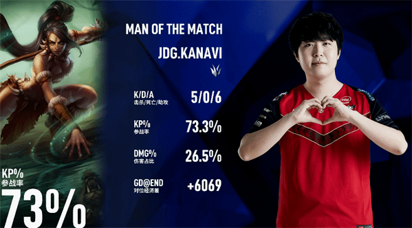 本局比赛MVP给到了JDG打野选手Kanavi的豹女!游戏网