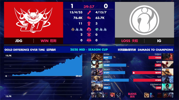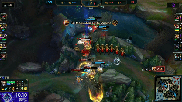 比赛来到39分钟,JDG在IG门牙塔处集火击杀掉盲僧并推掉IG基地,赢下比赛胜利!