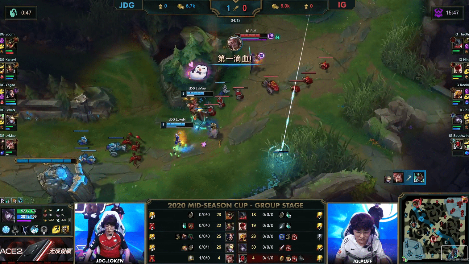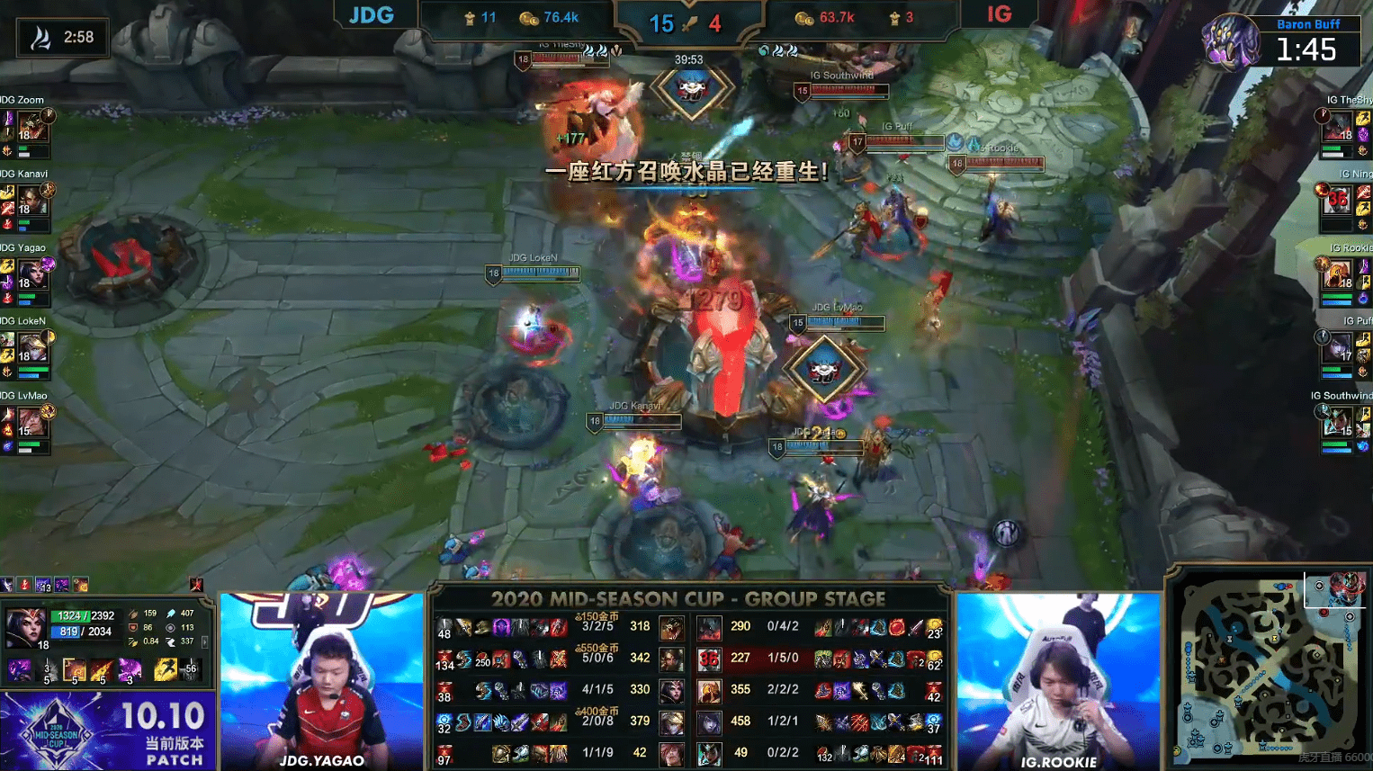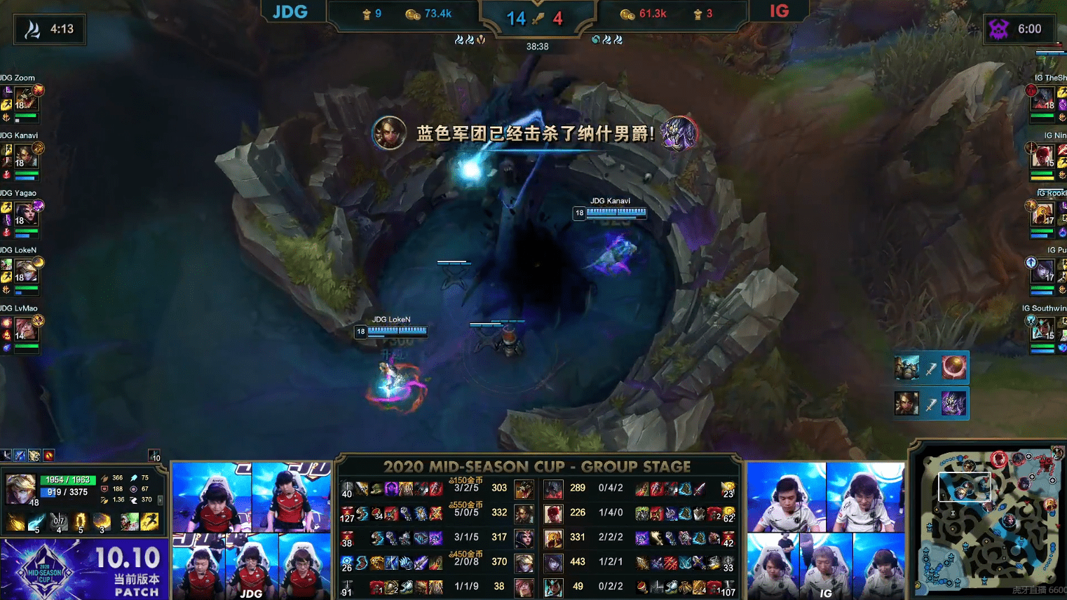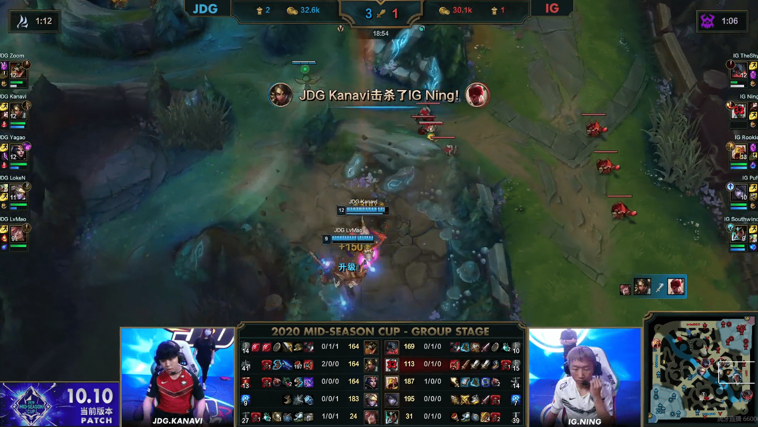 一场比赛最高对位压了5级,kanavi豹女全场等级领跑率先达到18级,而IG也欠缺一个强开团的点,只能是围绕着rookie沙皇防守,JDG依靠着野区优势不停地滚起雪球,掌控地图资源,借助大龙buff平推三路高地,稳稳地控下第二条大龙,不给IG任何机会。