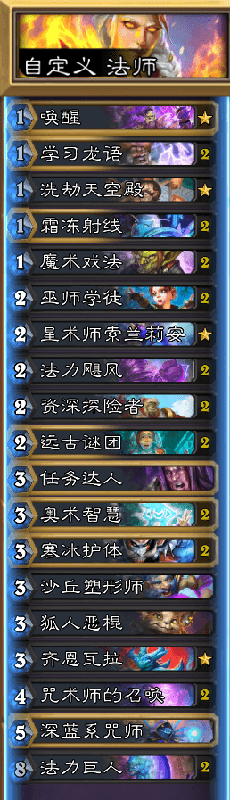 -巫师学徒和法力飓风仍是卡组最大的爆发点,甚至可以瞬间做完任务。唤醒不用等手牌空了再用,配合哀绿打出完成任务,收益也非常高,不用吝啬,随机法术也有可能拿到额外的唤醒。