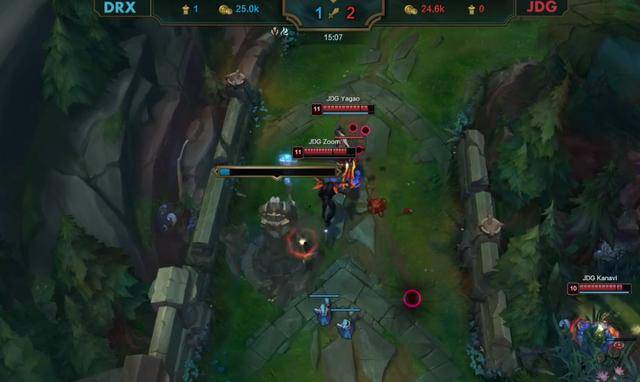 15分01秒,JDG上路辛德拉尝试越塔击杀腕豪失败,Doran极限闪现躲掉辛德拉推球,而下路DRX率先拔掉一血塔这波DRX小赚。