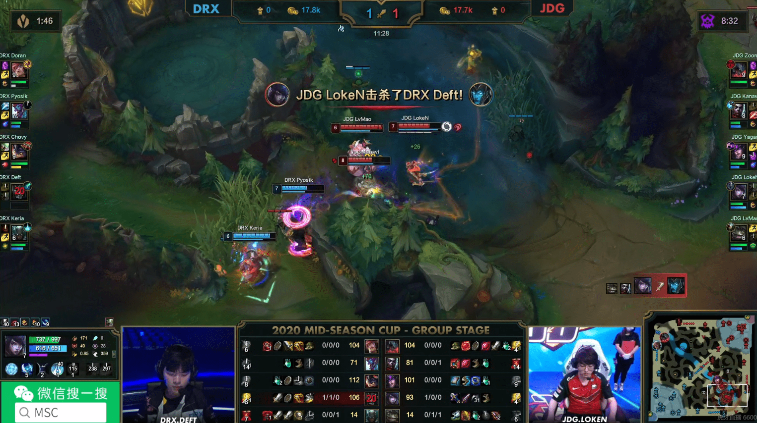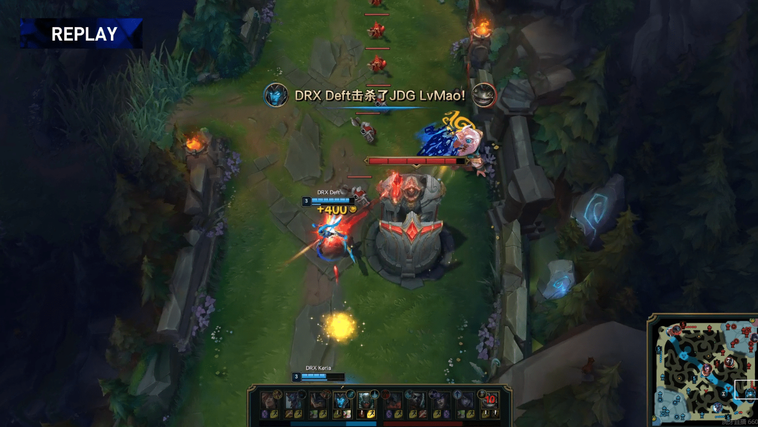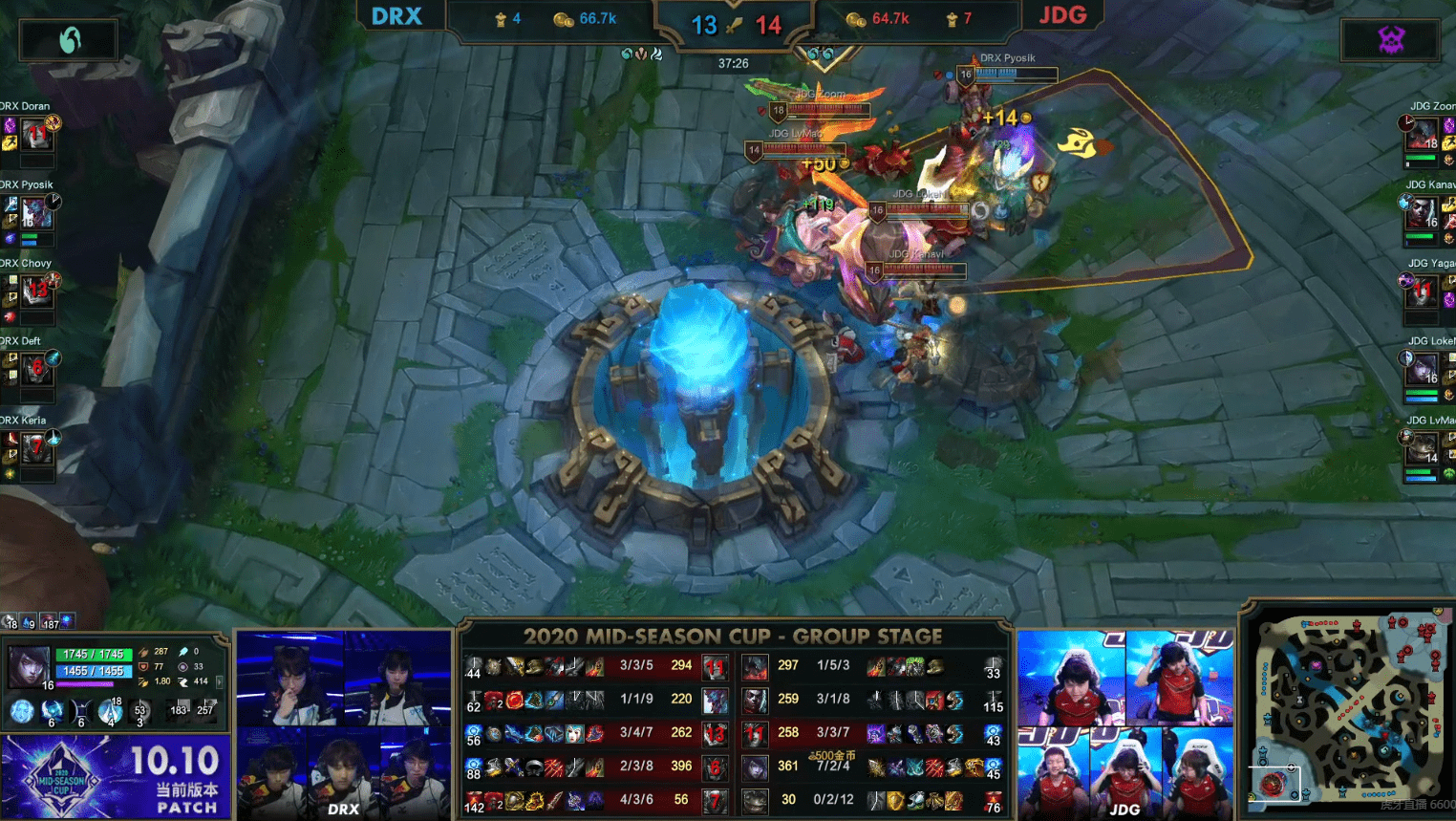 就在JDG抱团想要点掉中路一塔时,DRX及时回防,pyosik巨魔柱子卡住了LokeN厄斐琉斯位置,doran腕豪大招抱回秒杀AD,DRX追击又击杀2人,赢下团战成功顺势拿下了大龙buff!
