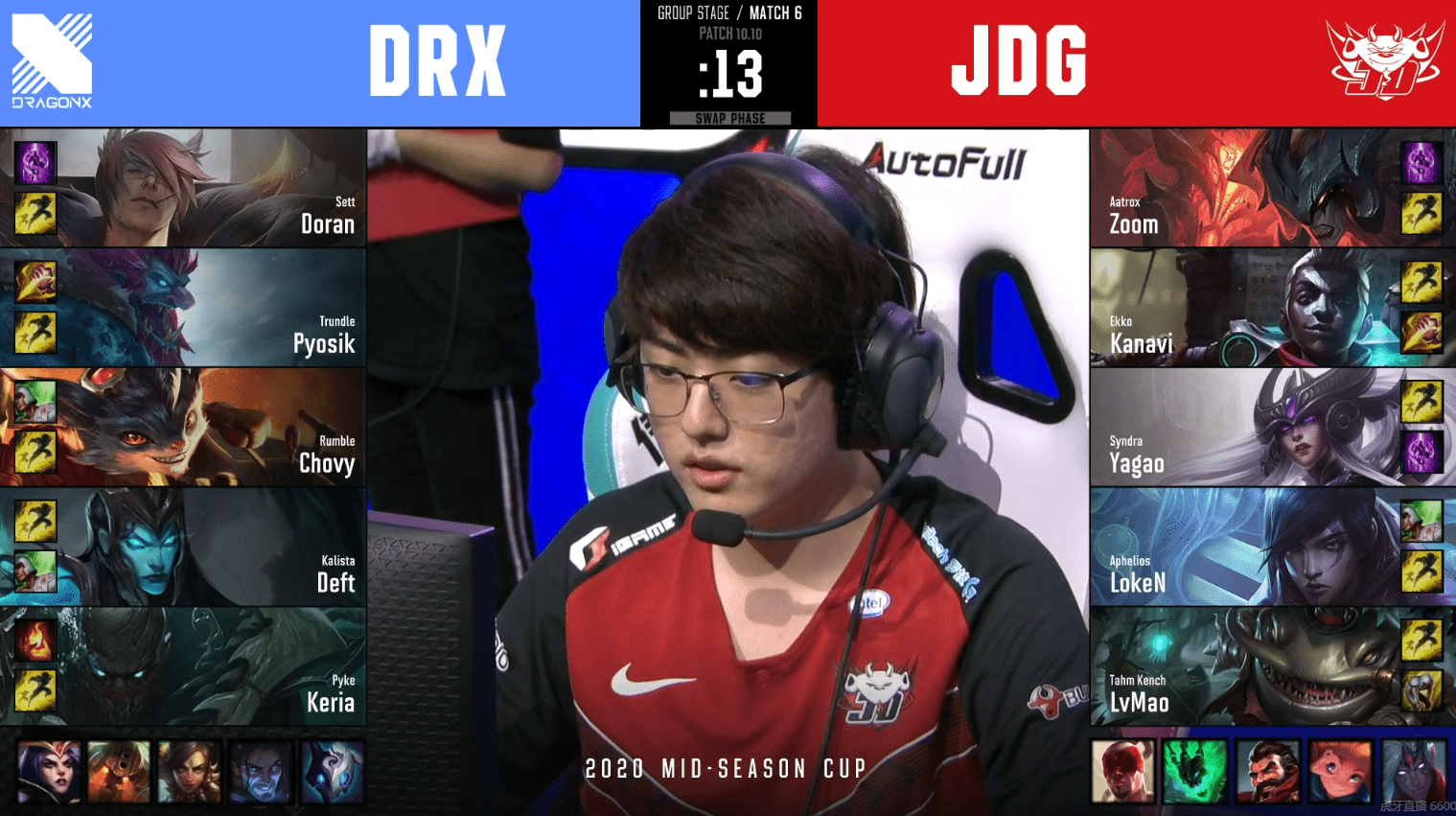 在今天的MSC季中杯B组小组赛中IG率先出局,JDG也陷入了生死局,最后一场对战DRX的比赛必须赢才能进入加赛,这局比赛中DRX选出了前中期强势阵容,将腕豪摇摆到了上路,下路拿到卡莉丝塔派克组合,而JDG则是锁下了一个四核阵容,给绿毛拿到保护型辅助塔姆。