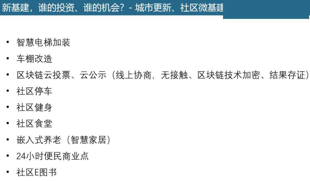 周向红在 “全景资本圈·云直播”节目中提出一个全新的观点,城市更新过程中的社区微基建,可能是一个非常不错的方向,其中包含了智慧电梯的家装、车棚改造、社区停车、社区食堂、嵌入性养老等等,这次两会中也特别提到了智能电梯的加装。