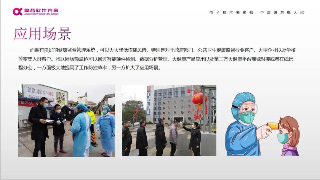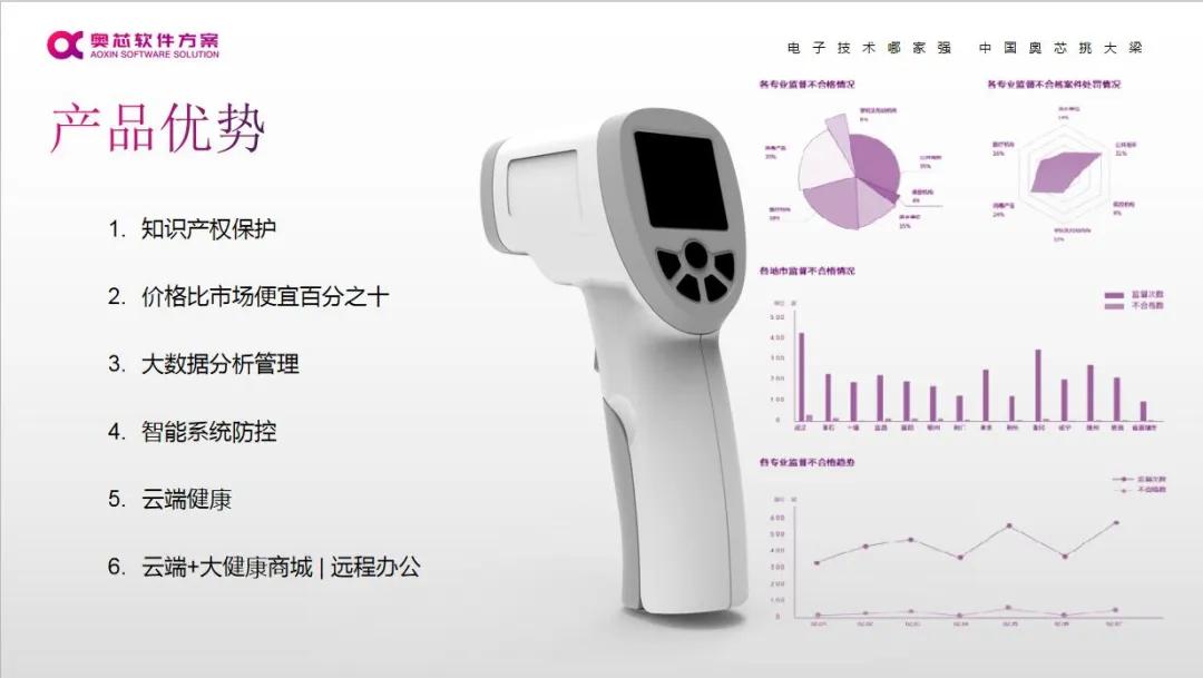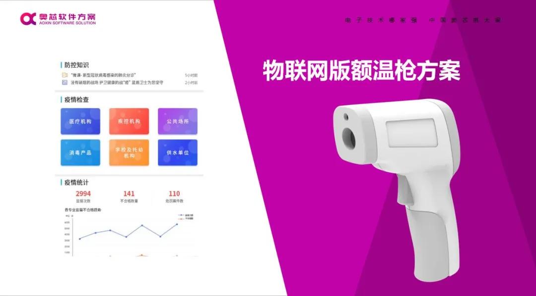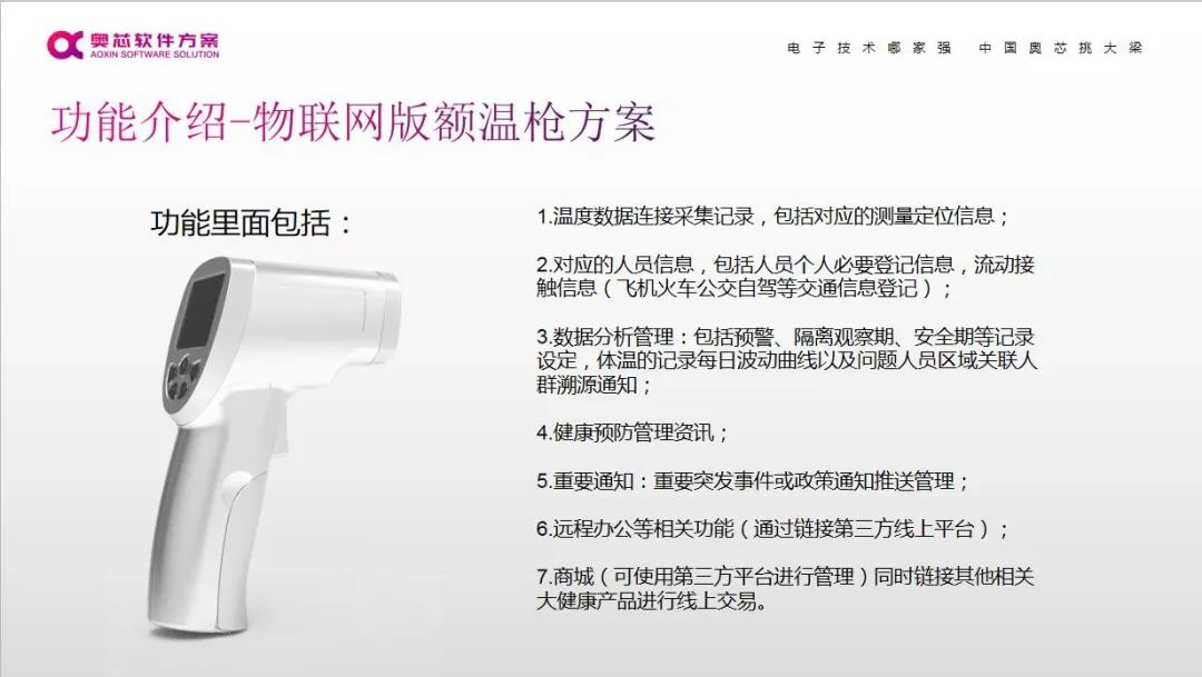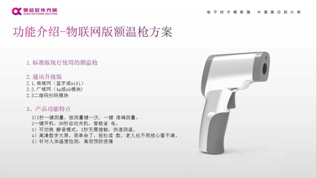 显然当前市场上流通的功能版红外体温检测的额温枪已经不能适应国家和全国各地的防疫中心需要,而物联网版本的额温枪可以作为全国各地防疫中心收集当地人群体温检测的大数据入口,将成为鉴别和诊断生化战役发生最前沿的哨兵利器。通过物联网版额温枪等前端鉴别和诊断,再结合人脸识别测温系统(人脸识别+测温+考勤+门禁+口罩识别)、热成像测温门等三款产品构建的奥芯智慧防疫系统才是健康安全的最佳保障。