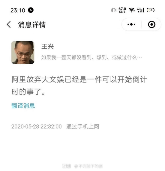 然而最近,美团王兴就在他的饭否上评论,“阿里放弃大文娱已经是一件可以倒计时的事了”,这显然是针对阿里大文娱长期在阿里系中的边缘化地位而提出的。2019财年,阿里大文娱所属的数字媒体和娱乐业务实现营收240.77亿元,当年阿里集团共收入3768.44亿,文娱板块仅仅占比6.4%,而2020财年这一占比下降到了5.3%,阿里大文娱体系在阿里集团内的营收比重一直较小,且增速也大幅放缓。