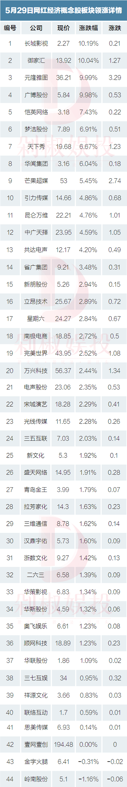 此外,新朋股份、恺英网络、祥源文化等仅涉及互联网文化、游戏等相关业务的,也被一些机构纳入了“网红经济”范畴。