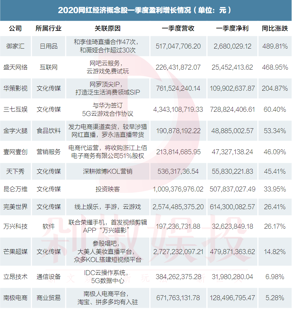 这些公司一季报中也均表示,净利增长是网红直播带货、线上销量良好的原因。
