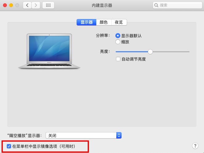 接着打开“显示器”,进入如下界面,选中“在菜单栏中显示镜像选项(可以用)”,