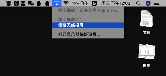 点击图标,会出现下面的对话框,选中单击“德恪无线投屏”,即可完全无线投屏显示。