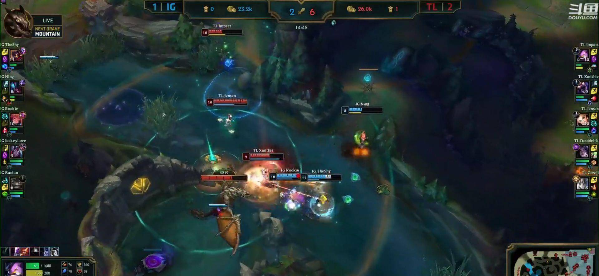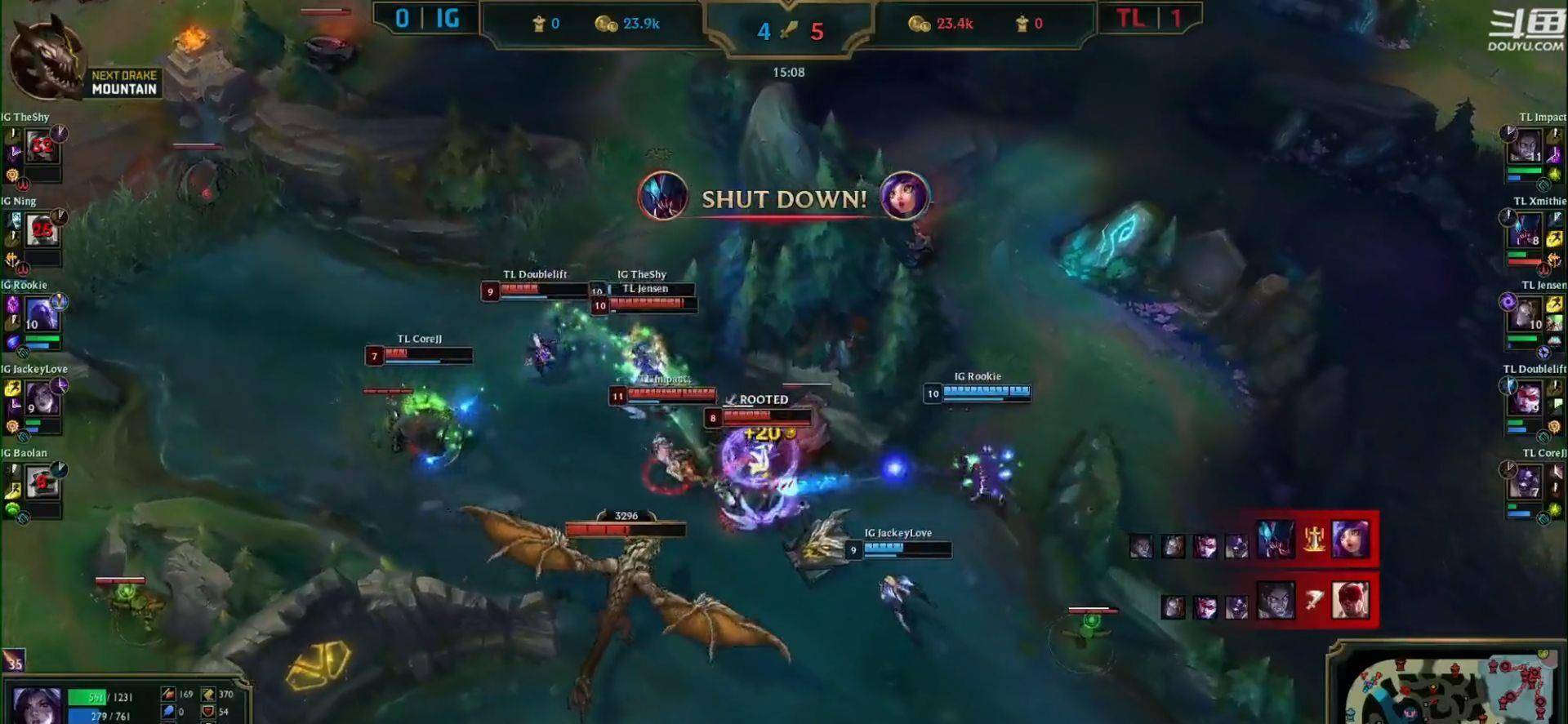 第四局,TL打野开始发力,前期配合下路加里奥,完成1血的击杀,随后中路GANK,又协助中单击杀了rookie,最恐怖的是15分钟时候的团战,小龙这波团战,奠定了TL获胜的基础,随后IG一直被牵着走,TL也一直求稳,最终在拿下2条大龙之后,再加上完美的运营,拿下了比赛,最终比分1:3.