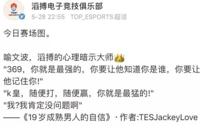 原标题:TES官博曝光后台趣事,JKL先鼓励369,又给Knight加油打气