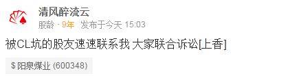 到下午,在阳泉煤业的股吧,也出现召集被骗投资者的帖子,另外还有在一些平台召集联合诉讼的帖子。