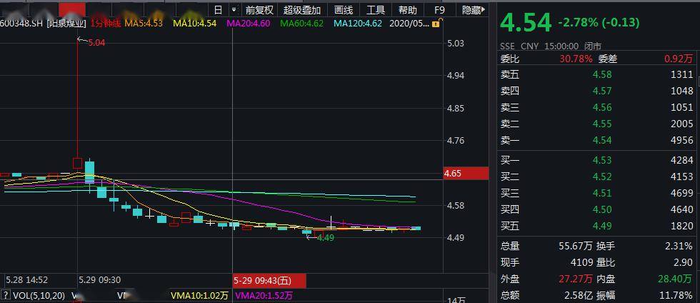 5月29日9:30分,随着A股开盘,阳泉煤业的故事却急转直下,同时也创下了1分钟的天量成交。阳泉煤业开盘4.68元,但一分钟K线图显示,公司股价瞬间达到5.04元,因为时间太快以至于分时图并未显示出该上冲迹象。仅1分钟时间,阳泉煤业成交额达到6890万元,成交量达到14.02万手,前5分钟成交额为1.01亿元,到9:35时股价也降至4.55元,跌2.57%;9:48时股价降至全天最低点4.49元,之后全天基本维持在4.5元附近徘徊;5月29日全天报收4.54元,跌2.78%,全天成交额2.58亿元。