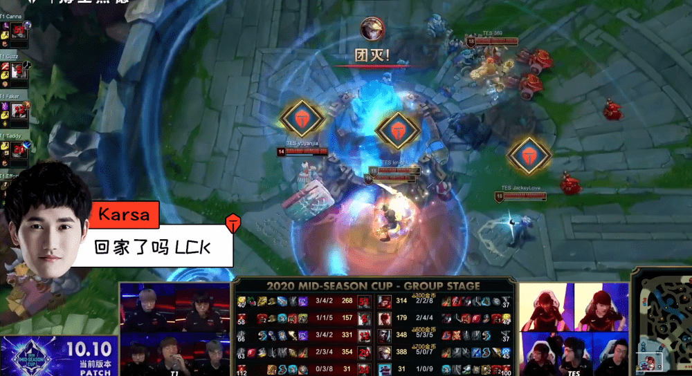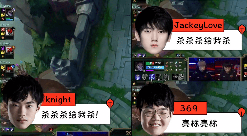 比赛决胜团Knight艾克时空断裂秒杀Faker,收拾完残局中上AD三TP下路推进,T1仅剩上单canna还存活,TES双C大喊开杀,五人合力把泉水开完金身的canna击杀当场,这个时候369开始大喊亮图标。