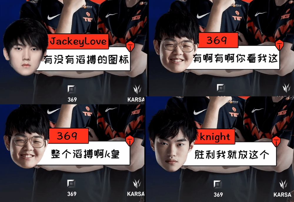 面对canna亮老鼠的行为,TES选手都比较生气,369在BP阶段就放话要杀八个,而阿水惦记着亮标。白色月牙一旁碎碎念怎么BP,TES队员在商量着怎么上TES图标,369是最积极的,指导队友滔搏图标在哪,指挥Knight把图标放上。