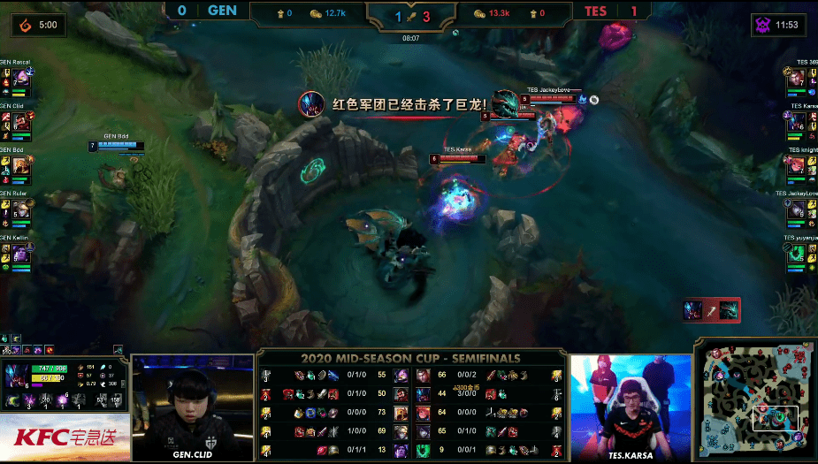 [22:49] TES选择直接开大龙,GEN跑速较慢未能阻止,随后滔博五人拿下大龙后全员撤退。